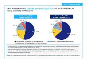 Der Versandhandel mit rezeptfreien Arznei- und Gesundheitsmitteln verbucht im Dreivierteljahr 2016 ein Umsatzwachstum von 15 % und eine Mengensteigerung von 12 %. Etwas mehr als die Hälfte des Umsatzes und zwei Drittel aller Packungen entfallen auf die Produktsparte Arzneimittel. Danach folgen Gesundheitsmittel und Kosmetik- /Körperpflegeprodukte mit 23 % bzw. 15 % Umsatzanteil, während auf Medizin- (z. B. Tests, Hilfsmittel etc.) und Ernährungsprodukte jeweils nur ein geringer Anteil am gesamten Produktportfolio des Versandhandels entfällt. Medizinprodukte wachsen derzeit allerdings am stärksten (Umsatz +32 %/Absatz +24 %), weshalb sich ihr Anteil weiter erhöhen wird.